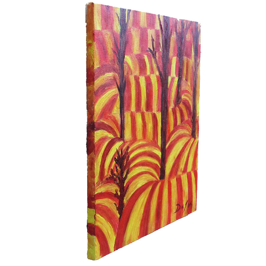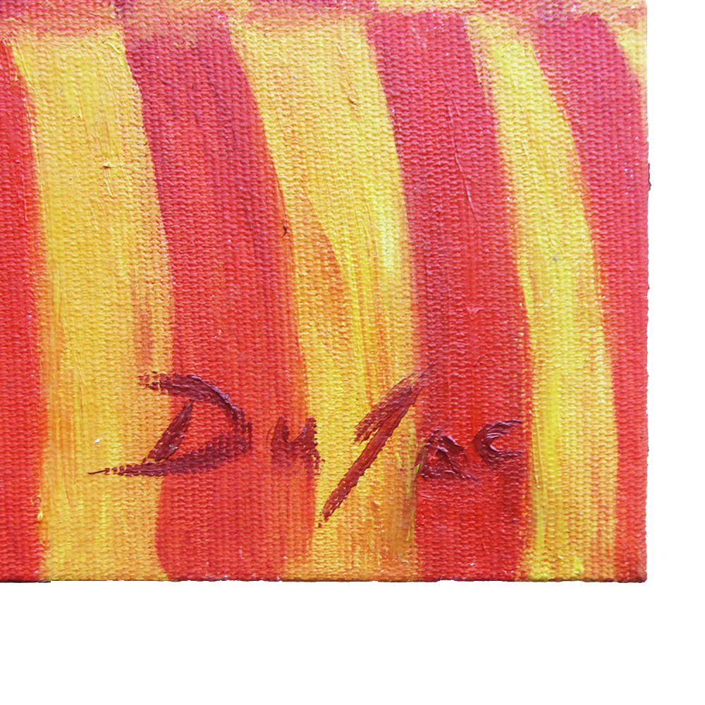 As cores operam como matéria incandescente. Amarelos intensos e vermelhos saturados se alternam em camadas, criando a sensação de combustão controlada, quase musical. A tinta a óleo sustenta essa fisicalidade: há corpo, atrito e pulso no modo como as transições acontecem, sem virar mero efeito. É uma pintura que parece irradiar — não por “representar” fogo, mas por organizar o fogo como linguagem.