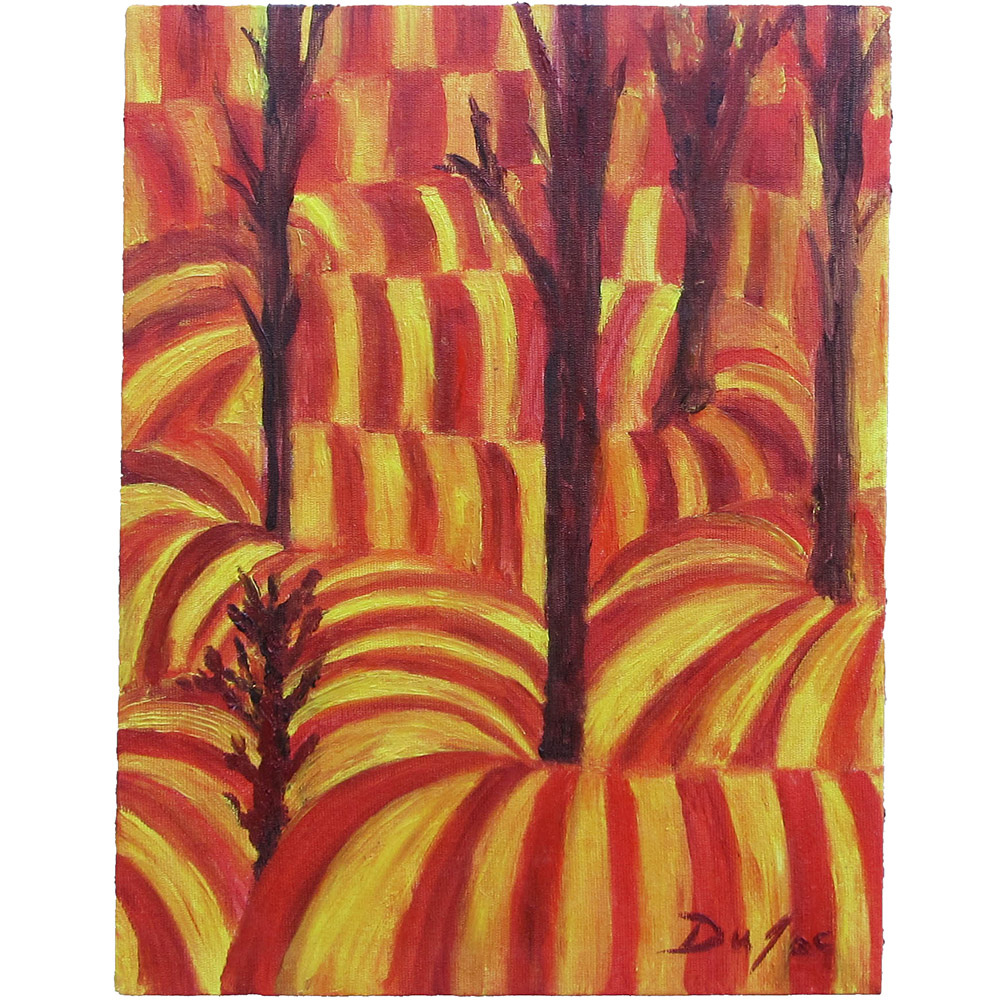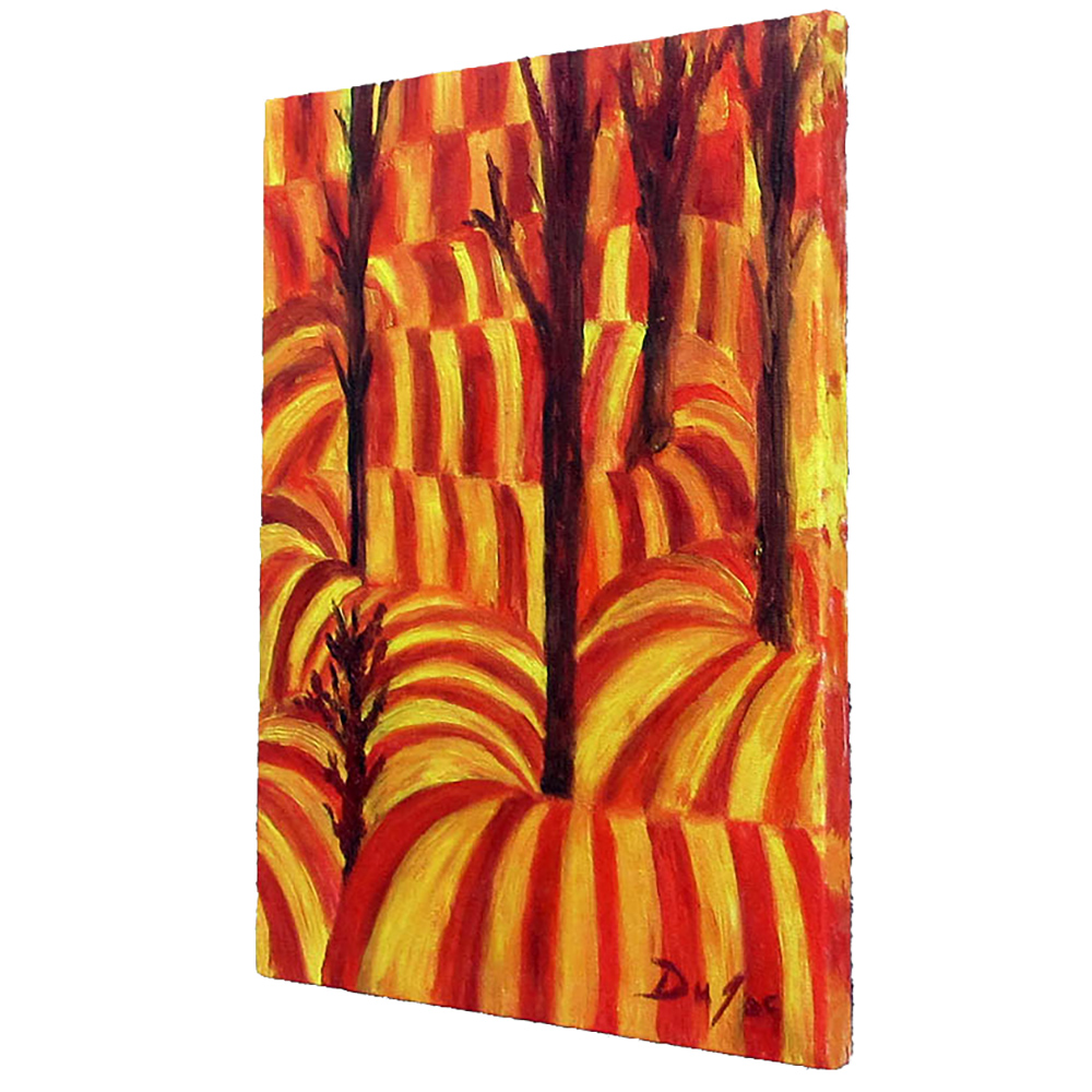 Entre essas ondas de calor, surgem troncos escuros, verticais, como se a paisagem estivesse de pé diante do incêndio. Eles funcionam como interrupções e como estrutura: colunas que seguram o olhar, marcando um compasso contra o fluxo das curvas. É aí que o trabalho toca um vocabulário moderno e construtivo — uma clareza de composição que lembra princípios bauhausianos e a síntese do modernismo, sem virar citação literal: o mito é filtrado pela forma.