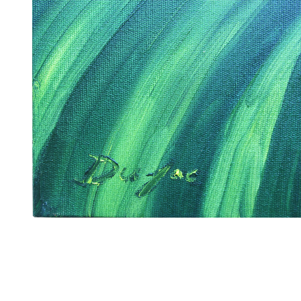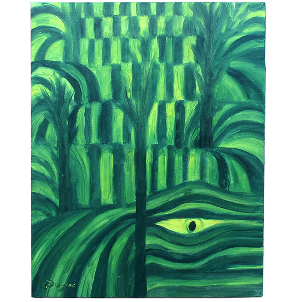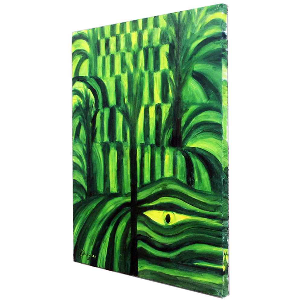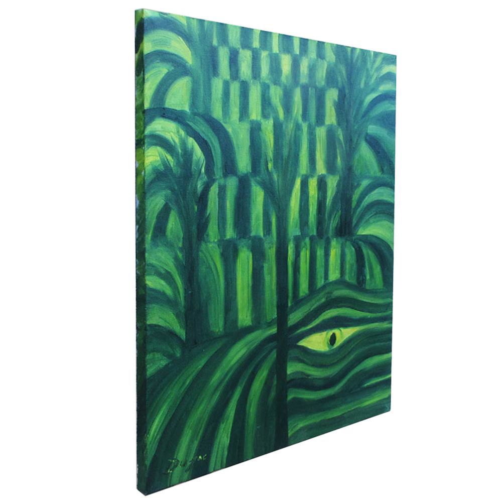 A pintura organiza o espaço em uma arquitetura de verdes: troncos verticais e planos sucessivos lembram um bosque que vira grade, enquanto curvas largas atravessam a cena como correntes de rio — ou como o corpo da serpente se deslocando por baixo da superfície. É um trabalho em que natureza e geometria se encostam: a mata se torna padrão, e o padrão, ameaça.