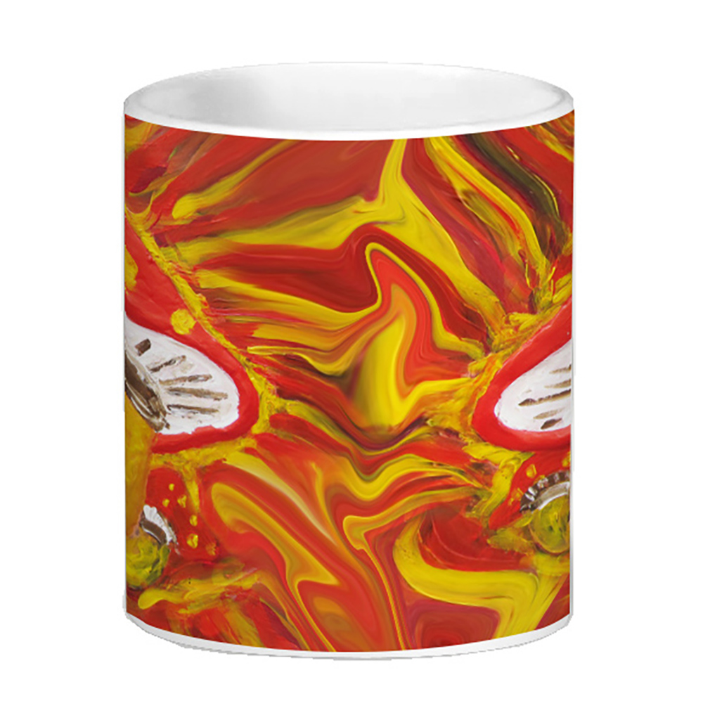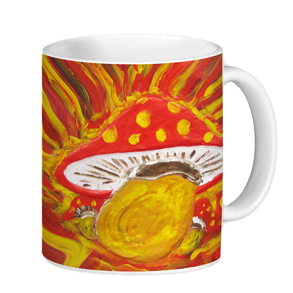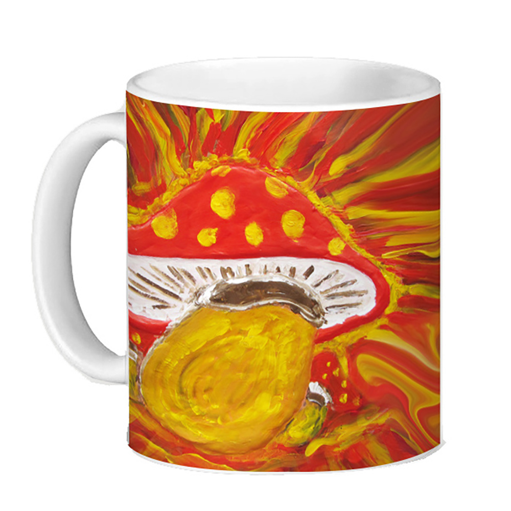 Caneca feita em cerâmica, com alça anti-térmica, mostrando um cogumelo em estilo psicodélico. Arte baseada na obra original Cogumelo Long Play.