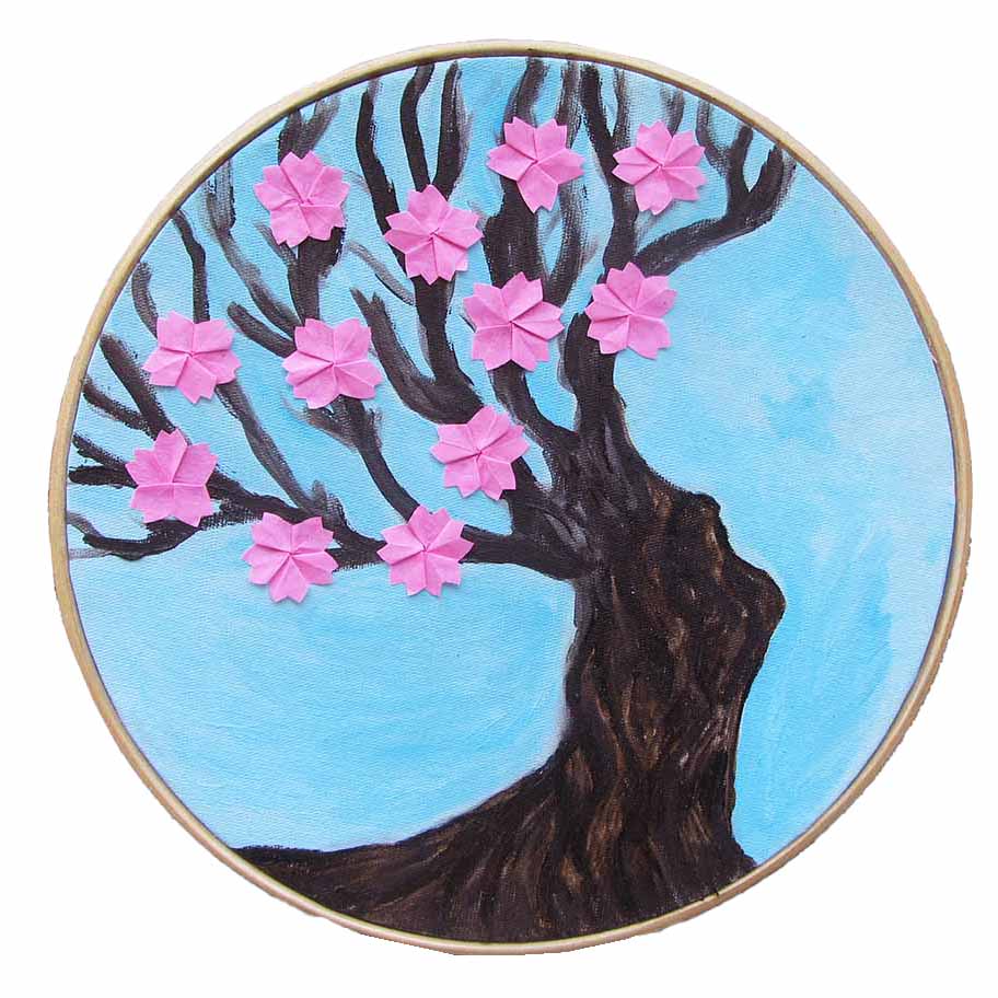 Quadro original com tela redonda e moldura de madeira retratando uma cerejeira em flor (sakura). Em técnica mista, foi feito em parceria, com pintura a óleo sobre tela de Leo DuLac e origamis de Amanda. Assinado no verso pelos artistas.