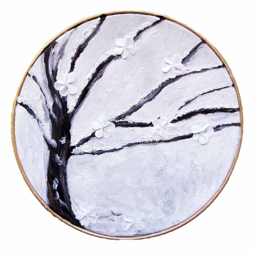Quadro original com tela redonda e moldura de madeira retratando uma cerejeira em flor (sakura) em um inverno com neve. Em técnica mista, foi feito em parceria, com pintura a óleo sobre tela de Leo DuLac e origamis de Amanda. Assinado no verso pelos artistas.