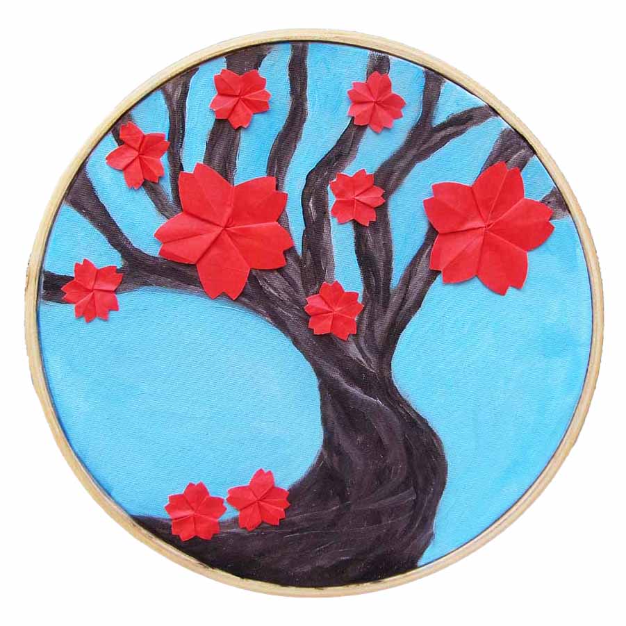 Quadro original com tela redonda e moldura de madeira retratando uma cerejeira em flor (sakura). Em técnica mista, foi feito em parceria, com pintura a óleo sobre tela de Leo DuLac e origamis de Amanda. Assinado no verso pelos artistas.