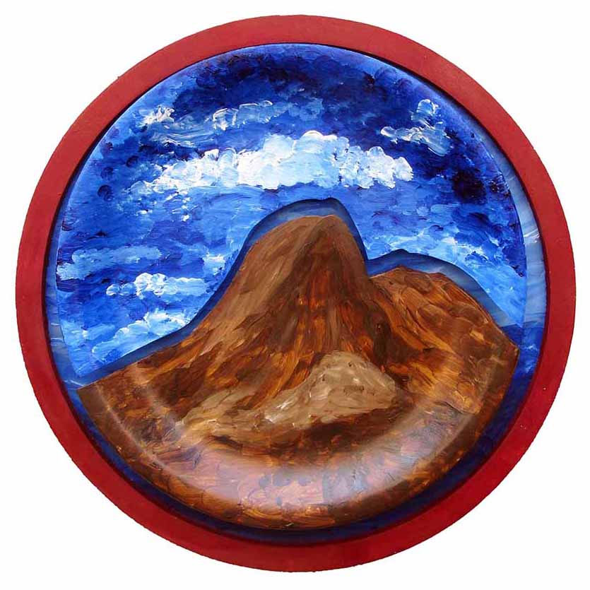 Em técnica mista, a obra retrata colinas sob um céu azul com nuvens. Tem efeito tridimensional devido à pintura sobre prato de cerâmica cortado no relevo dos morros e montado sobre suporte / moldura de madeira, também pintado com acrílica. Obra única, exclusiva e assinada pelo artista no verso.