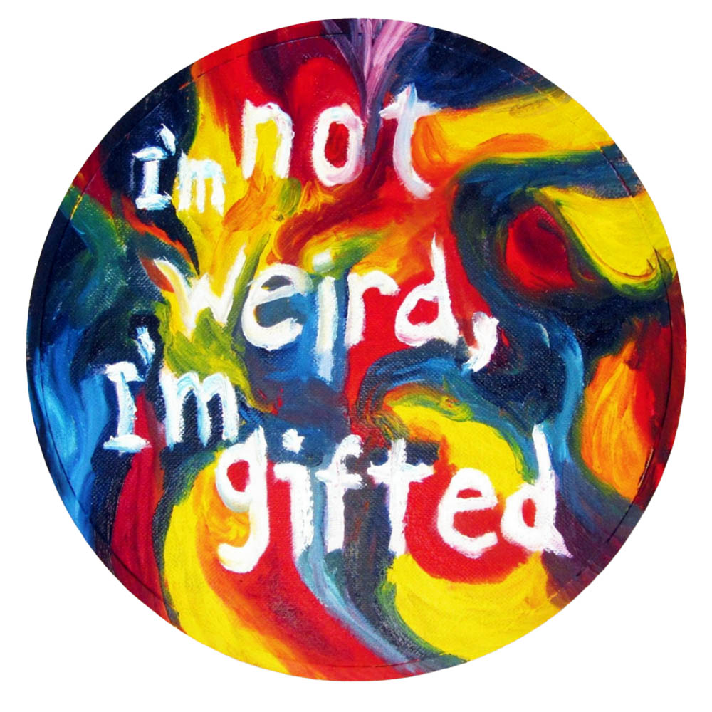 Quadro em formato circular com pintura a óleo sobre tela original, assinada pelo artista no verso. Ela traz a frase em inglês “I’m not weird, I’m gifted” em letras brancas sobre fundo colorido em estilo psicodélico.