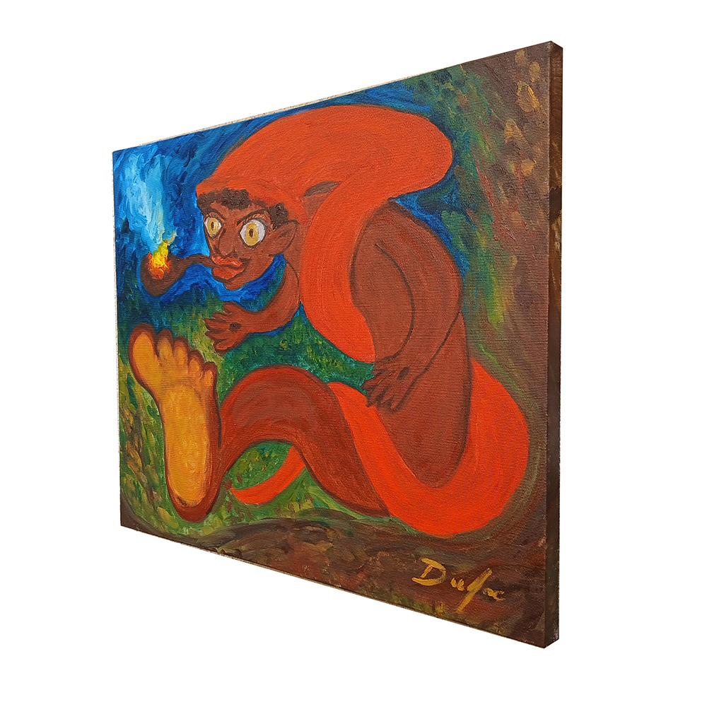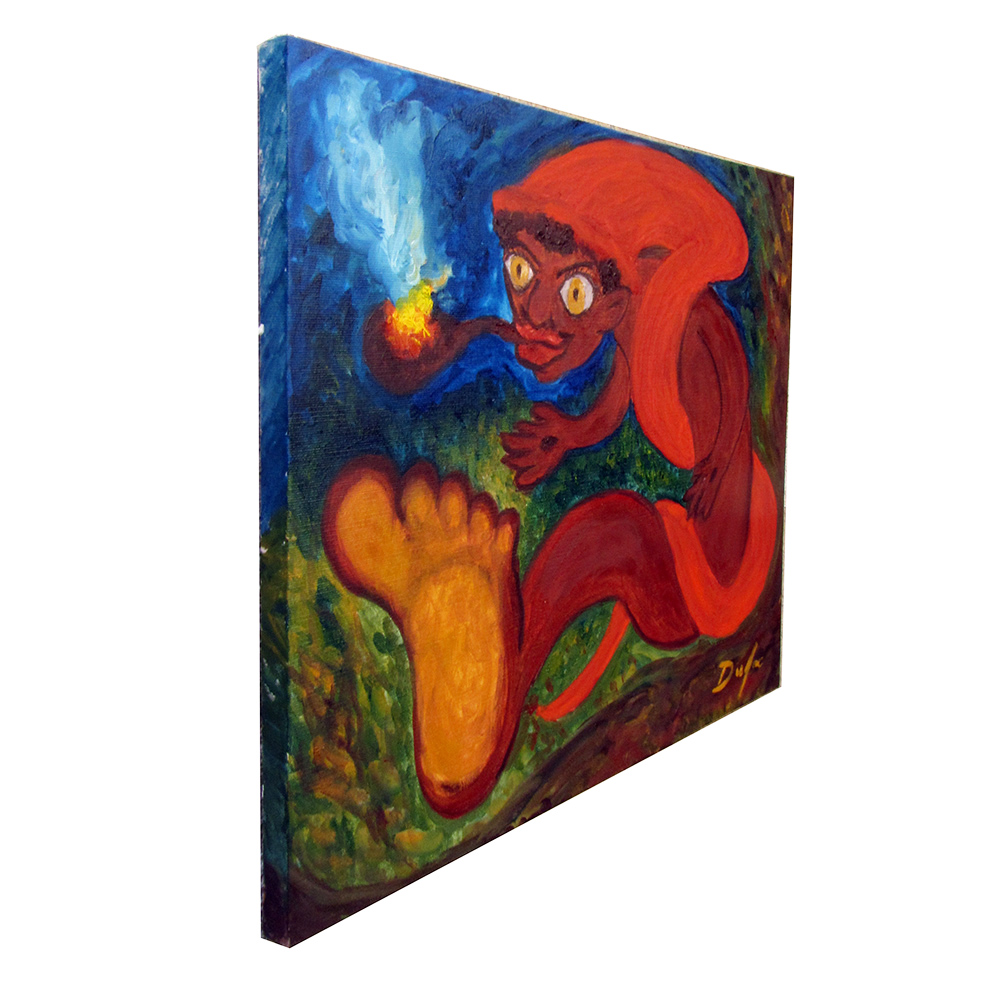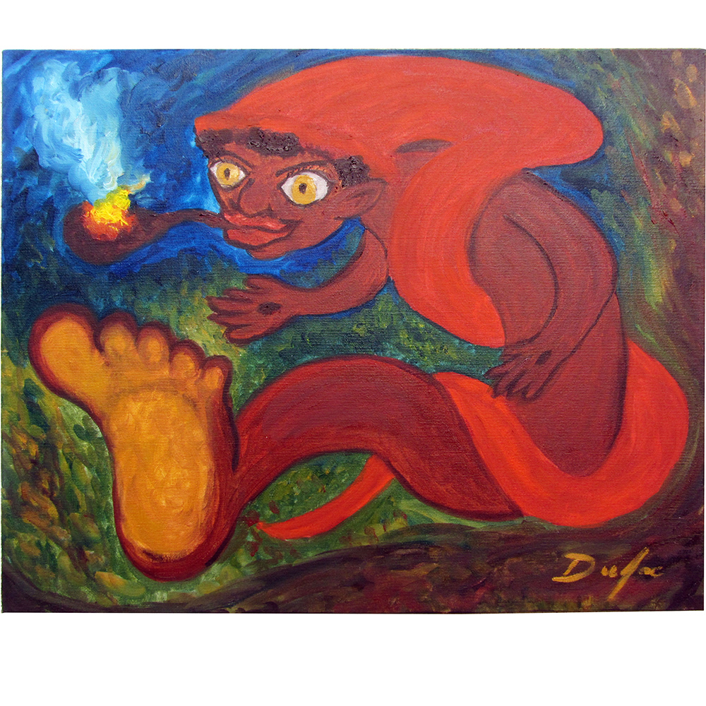 Ao engorrar o Saci, a obra não o imobiliza — ao contrário, intensifica sua dinâmica. O enrolar do gorro sugere continuidade, retorno e repetição. O mito não corre em linha reta: ele gira, reaparece, insiste. O Saci de Leo DuLac é uma figura construída pelo ritmo, pela torção e pela permanência do gesto.
