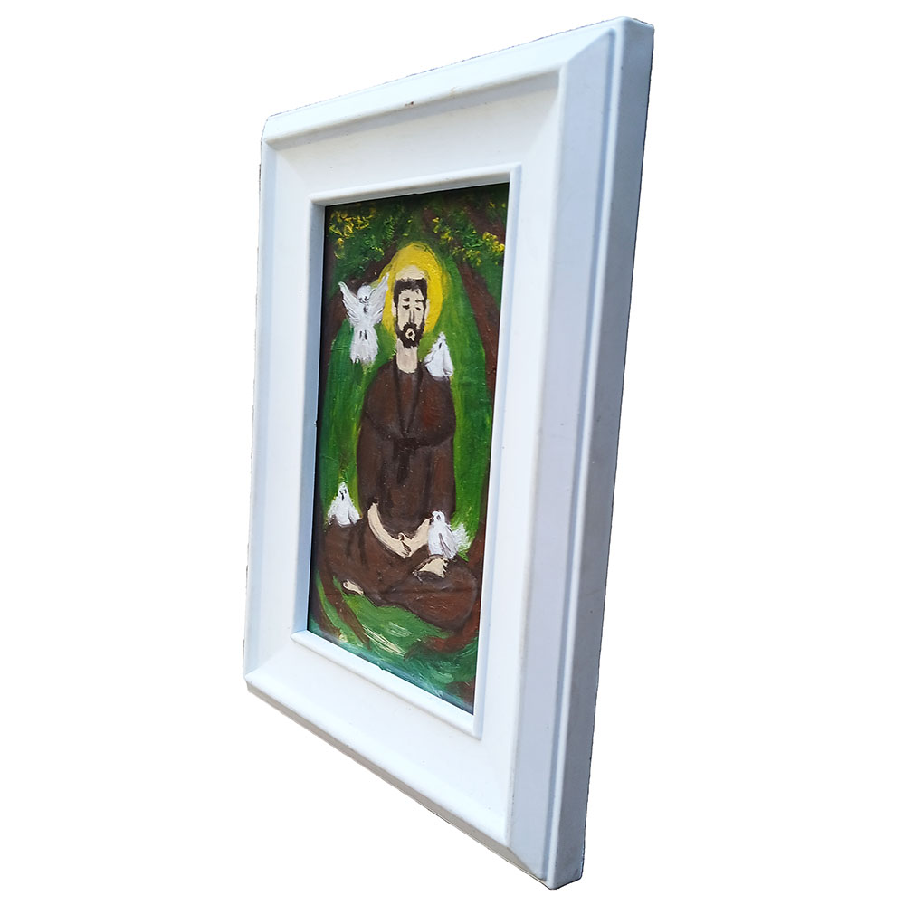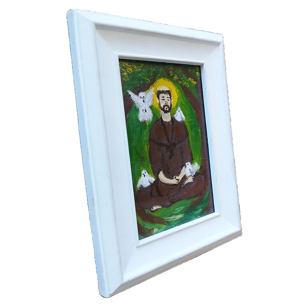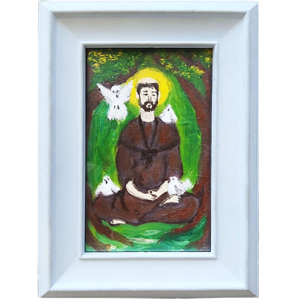 Pintura original a óleo sobre madeira retratando São Francisco de Assis, padroeiro dos animais e da vida simples, em momento de meditação na floresta. Já com moldura de madeira branca e proteção de acrílico. Assinado no verso pelo autor. Medidas 13 x 8 cm, medidas da moldura 19 x 14 cm.